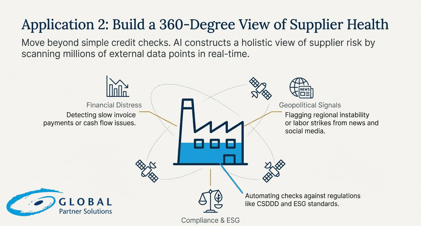 Moving beyond simple credit checks, AI constructs a 360-degree view of supplier risk by scanning millions of data points, including: