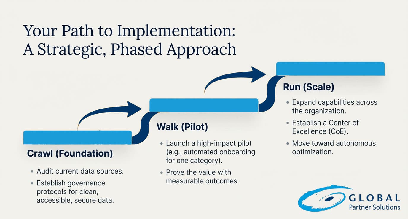 - Walk (Pilot): Launch a high-impact pilot (e.g., automated onboarding for one category). Prove the value with measurable outcomes.